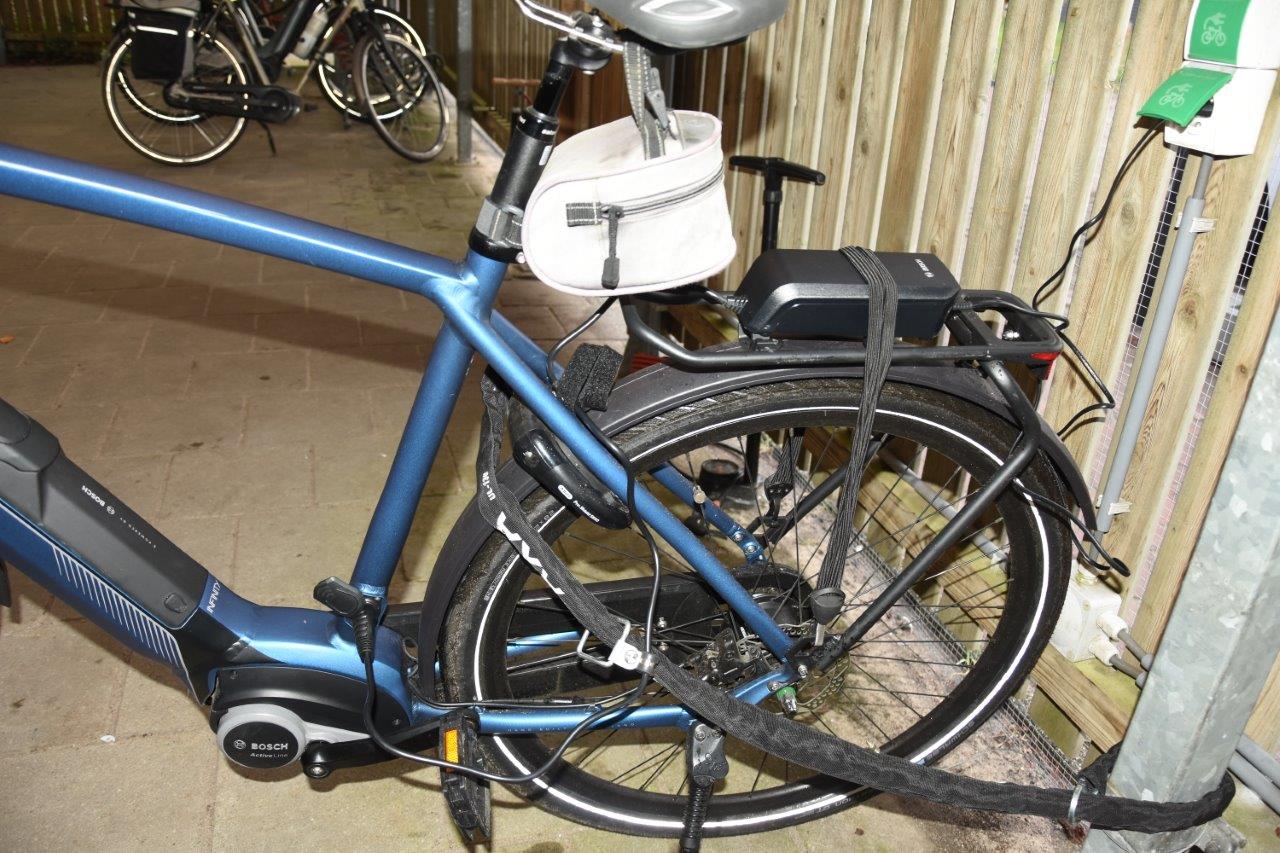 De fiets wordt opgeladen en de lader zit veilig geborgd aan de fiets.